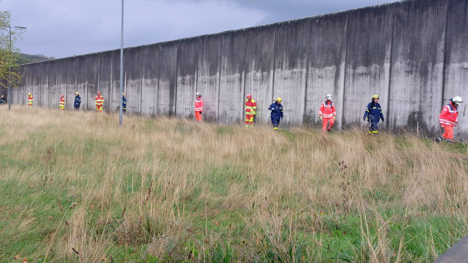 In der gesamten Anstalt hatten sich Versteckpersonen positioniert, die von Freunden, Bekannten und Familienmitgliedern dargestellt wurden und so ein realistisches Einsatzgeschehen ermöglichten. Nachdem alle vermissten Personen gefunden und versorgt waren, bildeten die Helferinnen und Helfer eine Menschenkette, um bei anhaltendem Dauerregen den Flugschreiber im weitläufigen Gelände systematisch zu suchen und sicherzustellen.