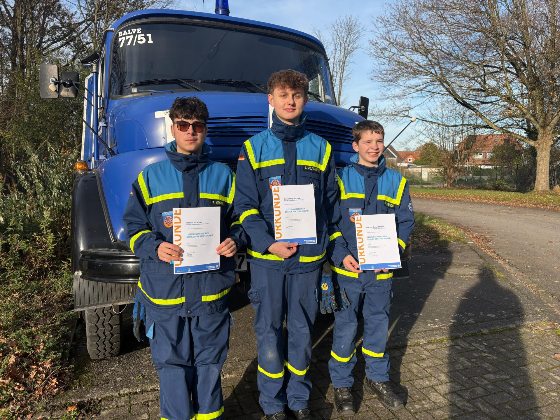 - Unsere drei bestandenen Prüflinge: Marlon, Leon und Rafael freuen sich über ihr Leistungsabzeichen. (Foto: THW)